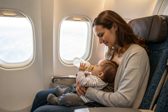 La variation de pression pendant le décollage et l’atterrissage peut être inconfortable pour les petites oreilles de bébé. L’allaitement ou le biberon sont vos meilleurs alliés à ces moments-là ! La succion aide à équilibrer la pression. Pour mon premier vol quand mon bébé avait 3 mois, j’ai allaité au décollage et il a dormi paisiblement pendant tout le vol.